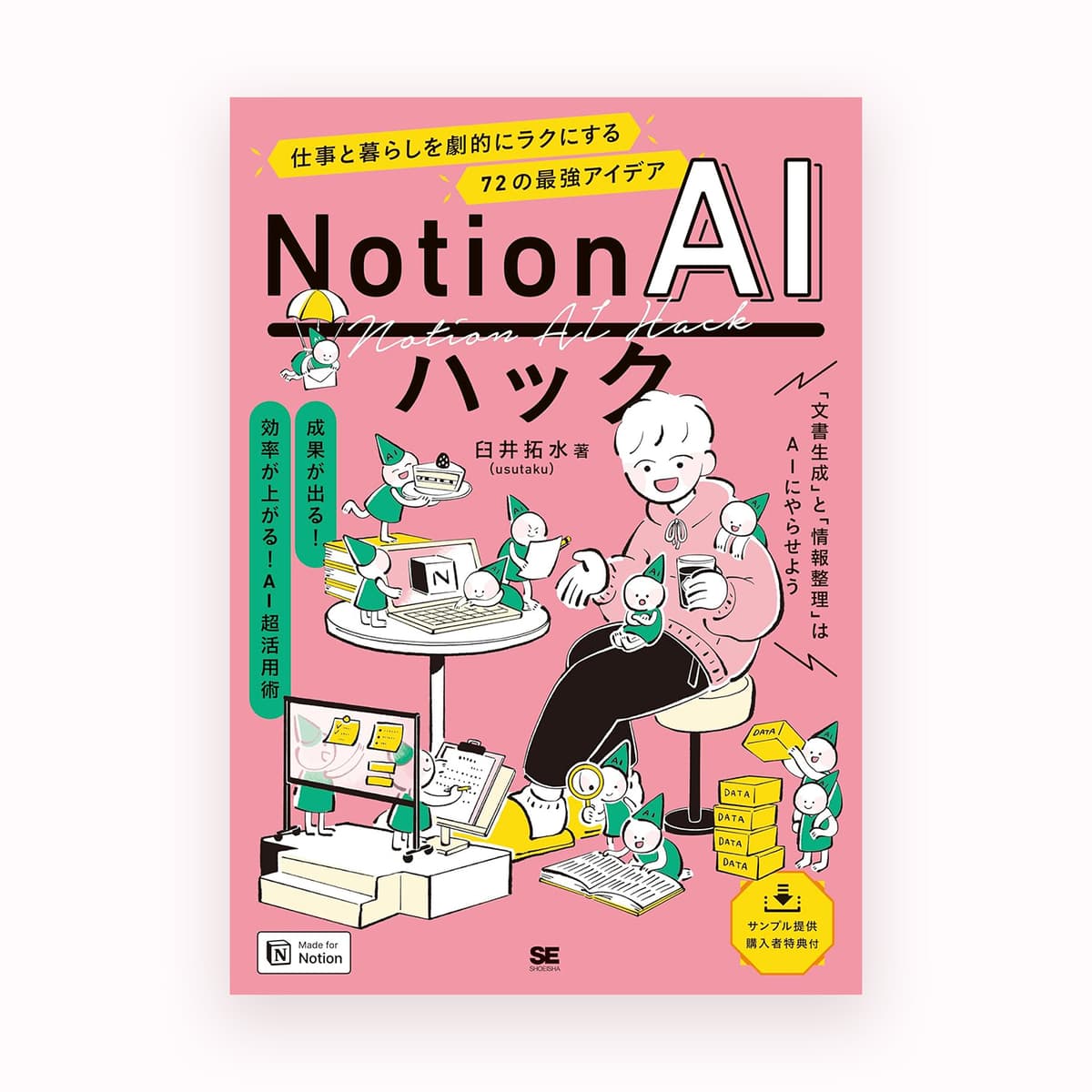 【WORKS】 「Notion AIハック 仕事と暮らしを劇的にラクにする72の最強アイデア」のカバーイラストを担当しました。 AIを小人に見立ててお仕事のお手伝いをしています。